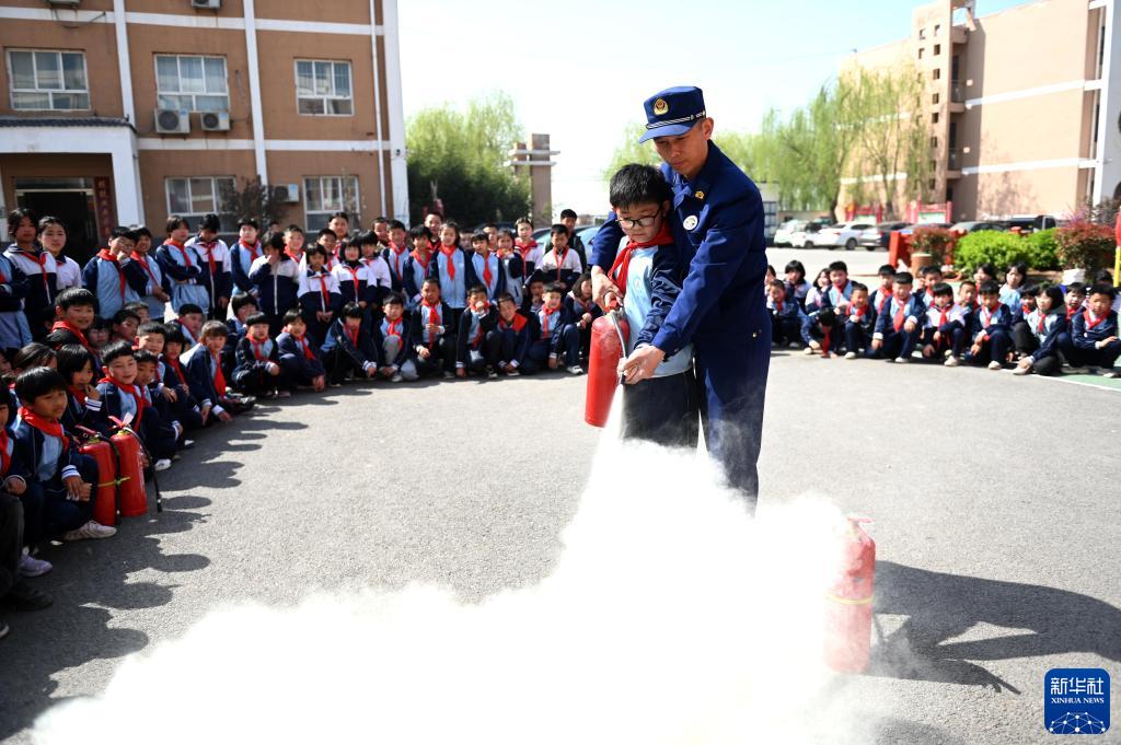 3月27日,在河北省邯鄲市肥鄉區毛演堡鎮中心校,消防員為學生示范滅火器的使用方法。