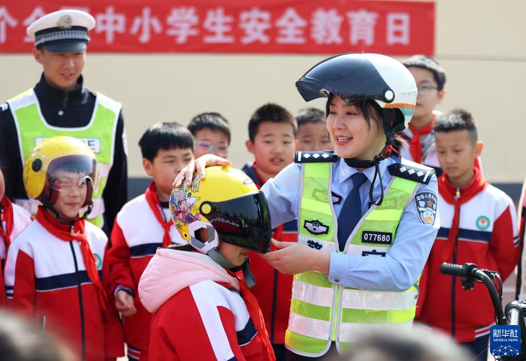3月27日,在山東省郯城縣東方紅小學,民警在為小學生講解佩戴頭盔的重要性。
