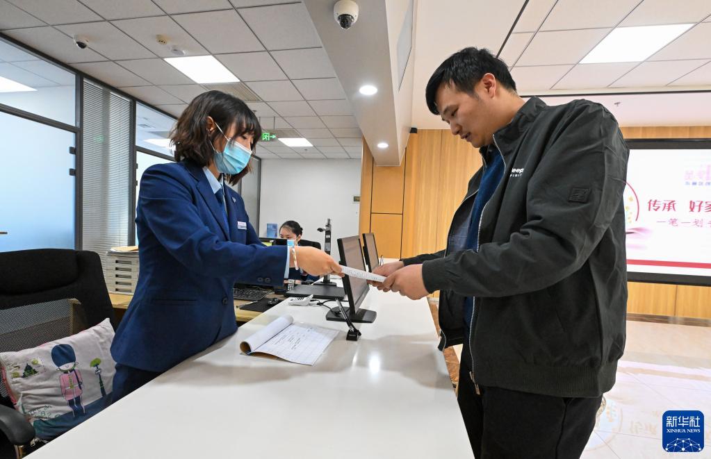 3月27日,在天津市東麗區政務服務中心,一名企業負責人(右)前來領取經“填空式”項目申報后的審批備案證明。