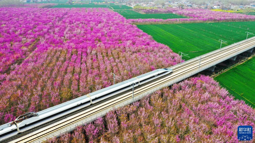 3月27日,高鐵列車從許昌市建安區小召鄉紫荊花海中駛過(無人機照片)。