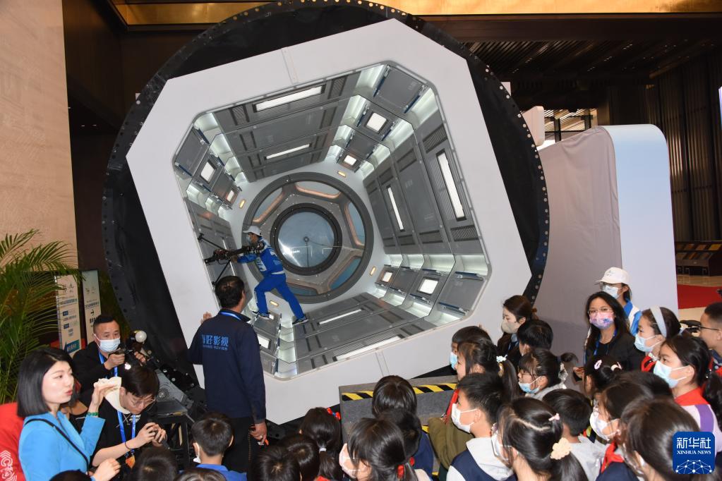 3月27日,小學生在觀看“流浪地球”太空艙演示項目。