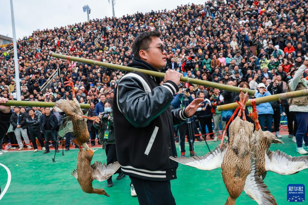 3月27日,村民挑著當地農特產品“三穗麻鴨”進入賽場。這是季軍銅仁市代表隊的獎品。