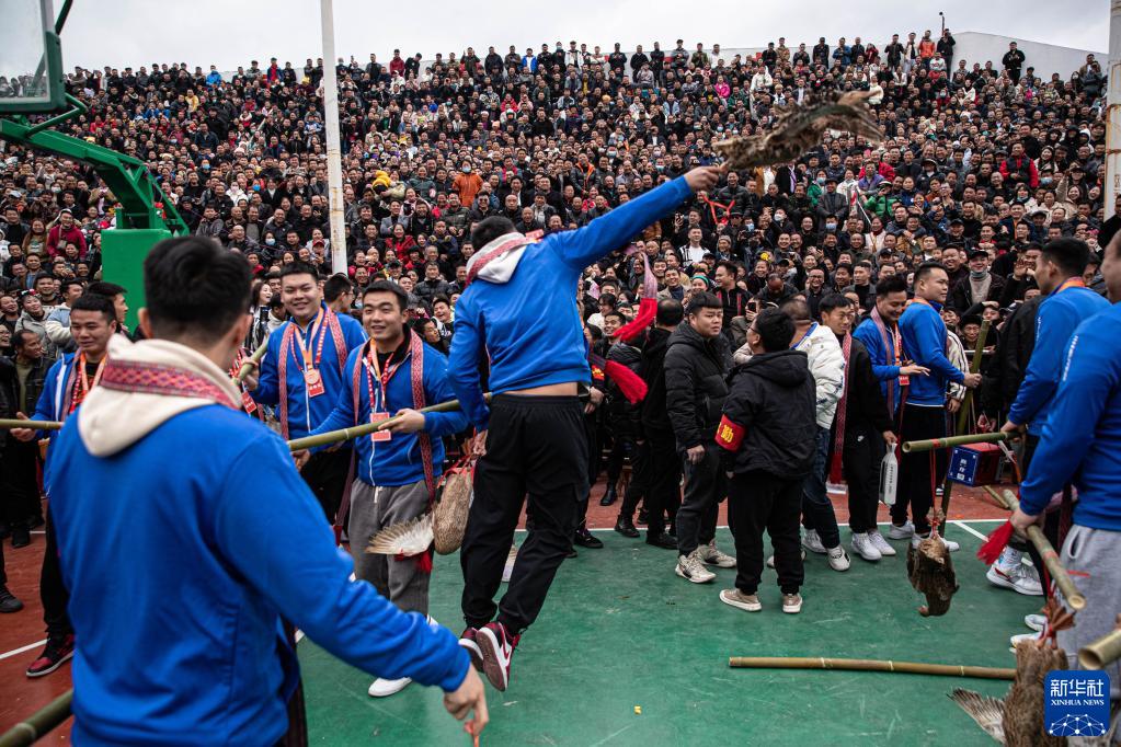 3月27日,季軍銅仁市代表隊球員在頒獎儀式上將獎品“三穗麻鴨”扔向觀眾席。
