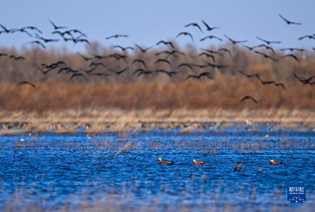 近日,天氣轉暖,冰雪消融,大批北歸候鳥來到內蒙古通遼市奈曼旗孟家段國家濕地公園覓食。天鵝、大雁、鸕鶿等各類候鳥聚集在此,給春日的濕地公園增添了勃勃生機。