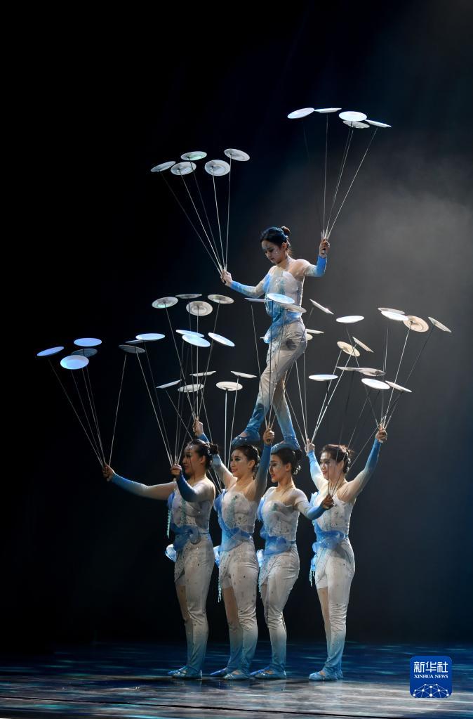 3月27日晚,在位于山東省濟南市的山東劇院,演員表演雜技節目《集體花盤》。