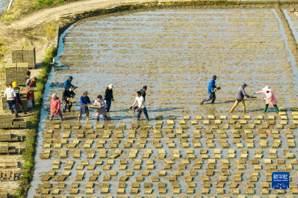 3月28日,在浙江省余姚市黃家埠鎮上塘村,農民在稻田里擺放早稻機插秧盤(無人機照片)。