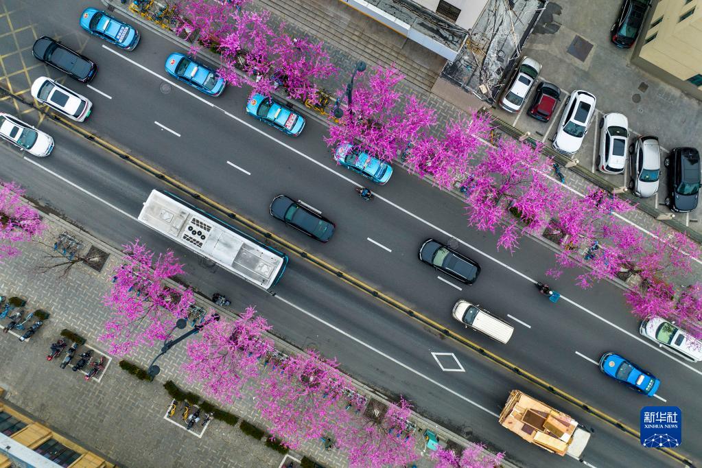 近日,浙江省寧波市鄞州區甬港北路兩側的紫荊花開放,一串串紫色的花朵嬌艷醉人。穿行其間,一路繁花相伴。