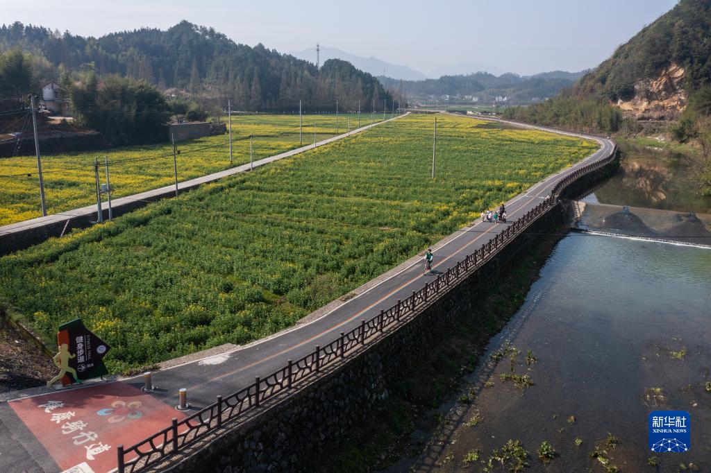 3月28日,這是杭州市臨安區太陽鎮以稻香和水杉為主題的健康騎行道,總長度11.7公里(無人機照片)。