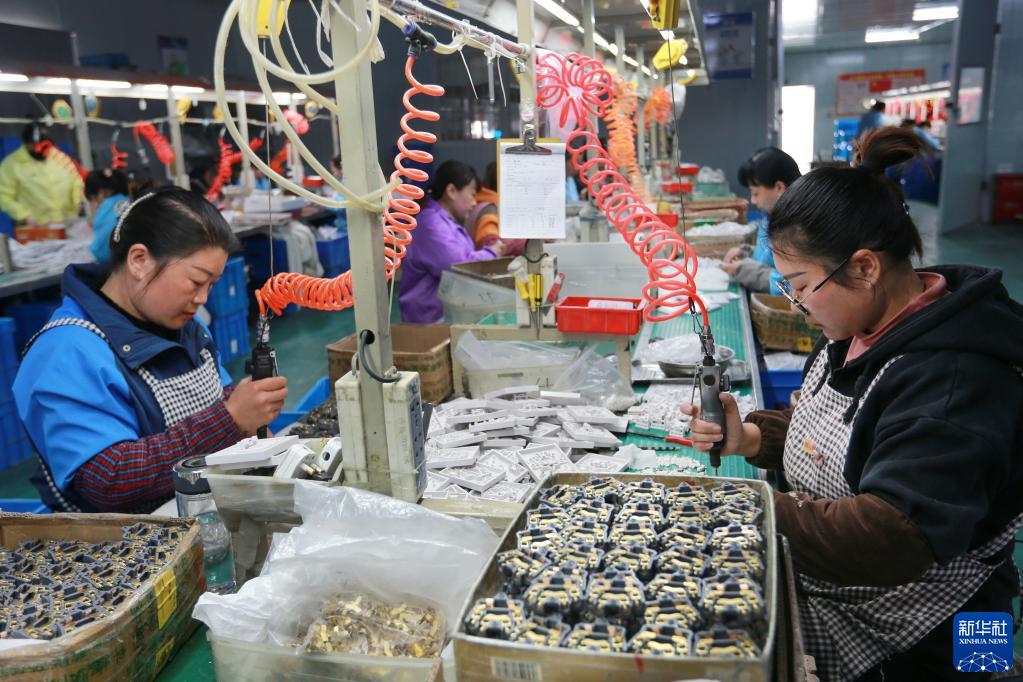 3月28日,在淮北市杜集區石臺鎮農民工創業園,一家開關生產企業的工人在車間內忙碌。