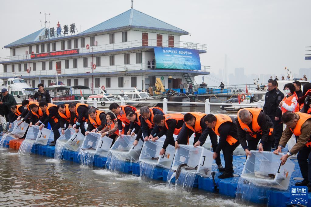 3月28日,工作人員在武漢漁政碼頭放流中華鱘。