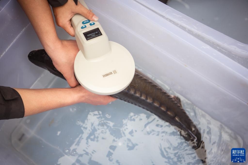 3月28日,在武漢漁政碼頭放流活動現場,工作人員對中華鱘進行標記。