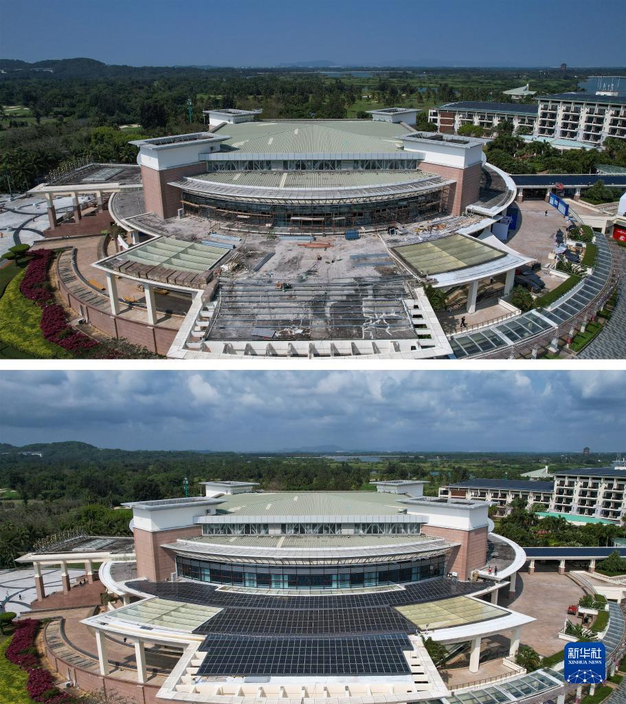 這是一張拼版照片:上圖為博鰲零碳示范區內改造前的博鰲亞洲論壇國際會議中心(2月24日攝,無人機照片);下圖為改造后的博鰲亞洲論壇國際會議中心(3月15日攝,無人機照片)。