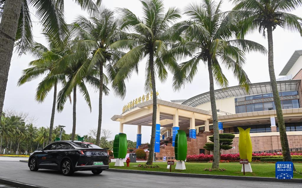 3月28日,一輛新能源車從博鰲零碳示范區內的花朵風機前駛過。