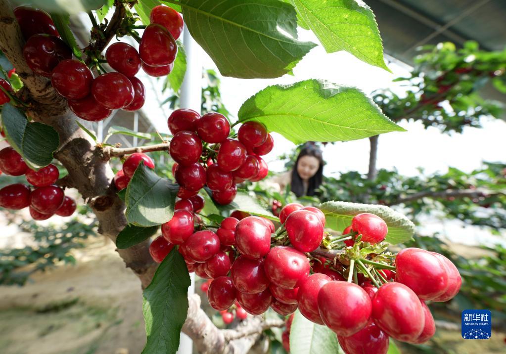 3月28日,游客在秦皇島市海港區海陽鎮常香苑家庭農場的大棚內采摘櫻桃。