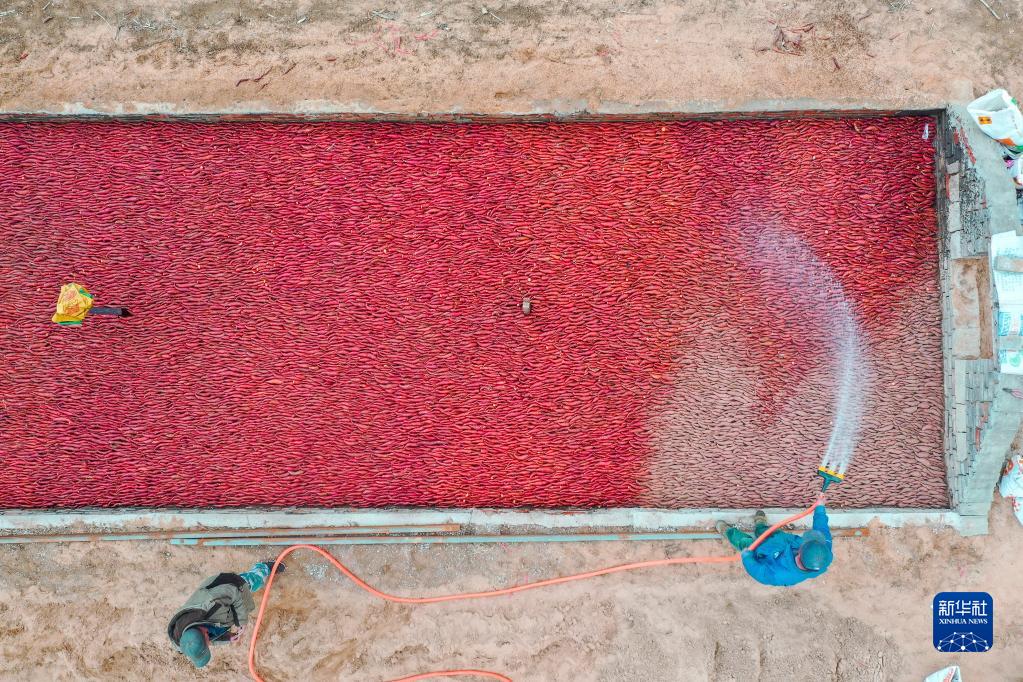 河北省灤州市榛子鎮南新莊子村村民在給育苗薯炕澆水(3月28日攝,無人機照片)。