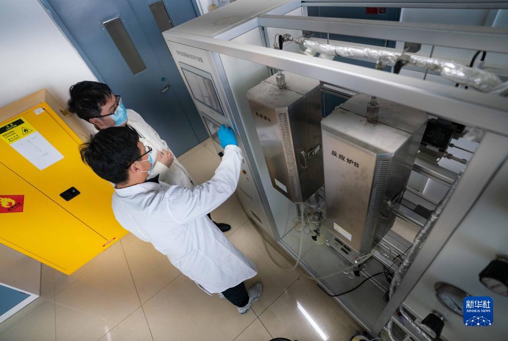 3月28日,南開大學—滄州渤海新區綠色化工研究院課題組工作人員在調整新型航空煤油制取設備相關參數。