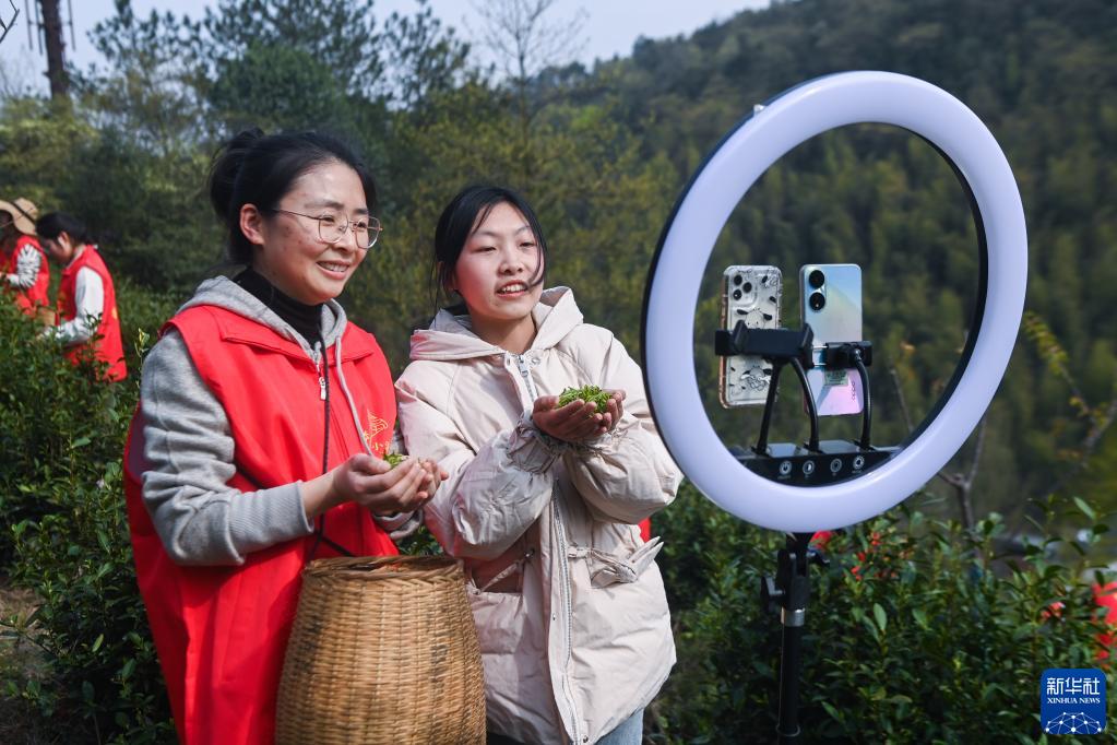 3月28日,大岕口村共富工坊的“杏?!绷x工在茶山上進行直播帶貨。