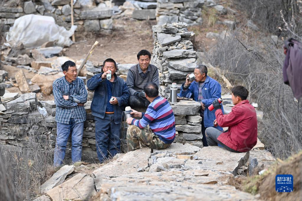 在位于山西省壺關縣大峽谷鎮青龍峽村的太行山上,村民在修路間隙喝水休息(3月23日攝)。新華社記者 楊晨光 攝