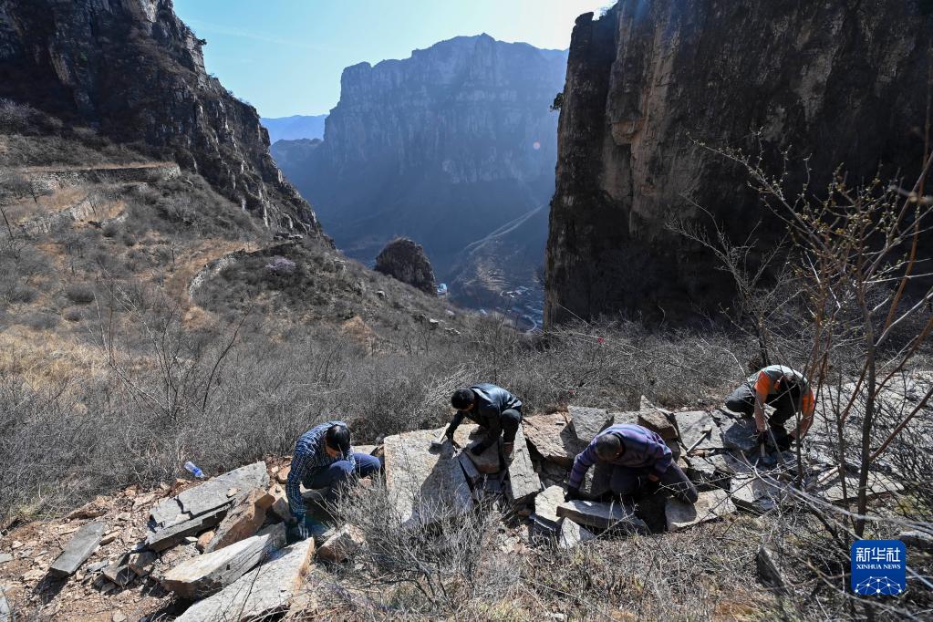 村民在位于山西省壺關縣大峽谷鎮青龍峽村的太行山上修路(3月8日攝)。新華社記者 楊晨光 攝