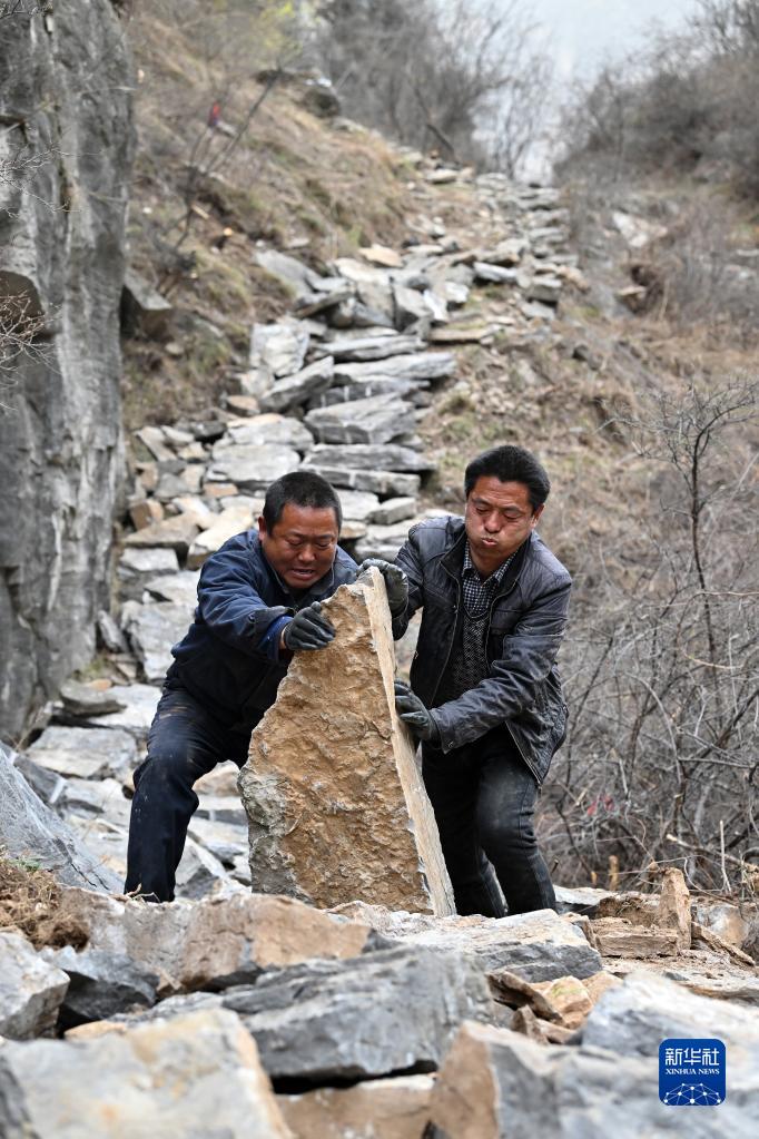 在山西省壺關縣大峽谷鎮青龍峽村,牛何松(右)和牛永剛在搬運石塊(3月23日攝)。新華社記者 詹彥 攝