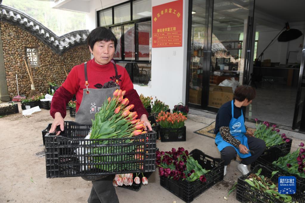 3月28日,經營花海的浙江舞花者園藝有限公司工作人員在制作鮮切花產品。
