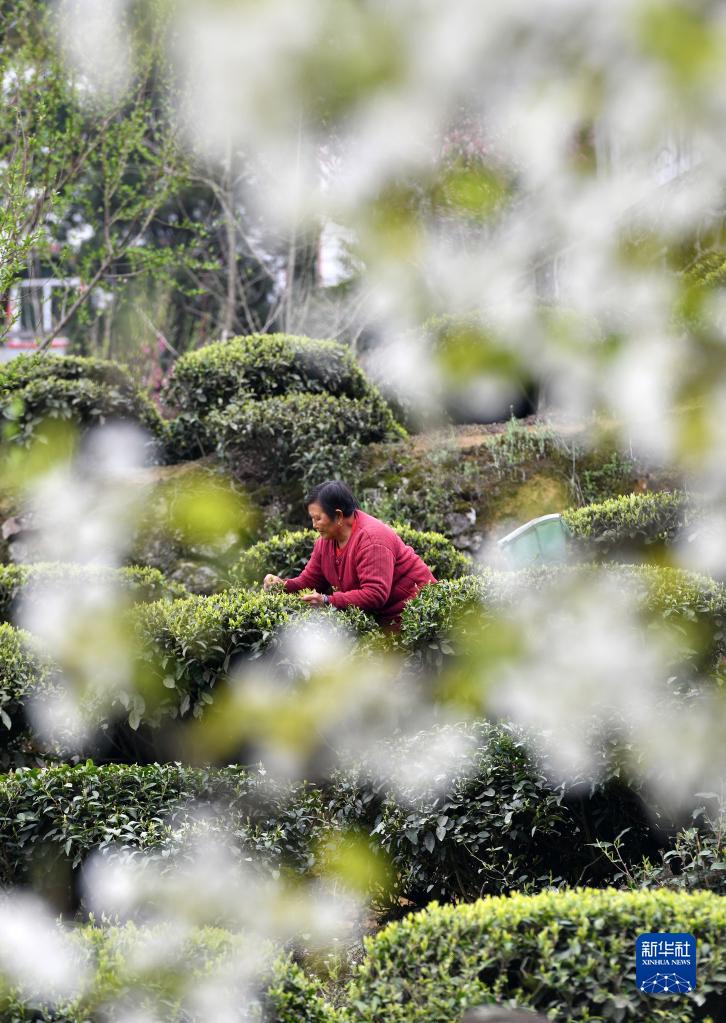 3月28日,茶農在湖北省宜昌市秭歸縣茅坪鎮松樹坳村一茶園采摘明前茶。