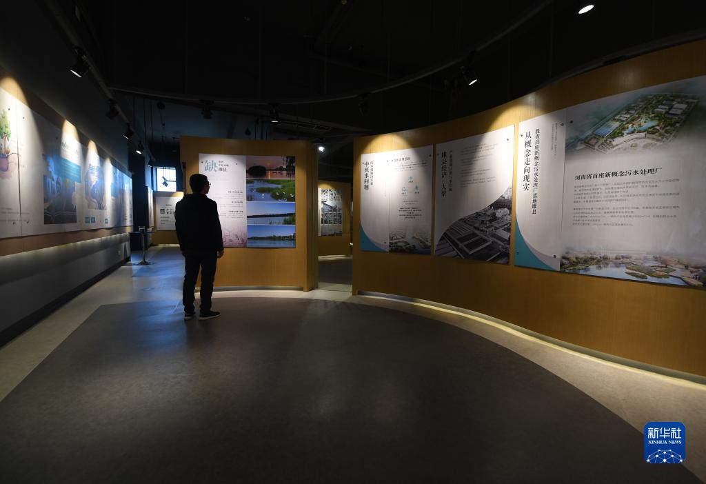 3月28日,在睢縣第三污水處理廠展廳,參觀者在觀看污水處理相關知識的展覽。