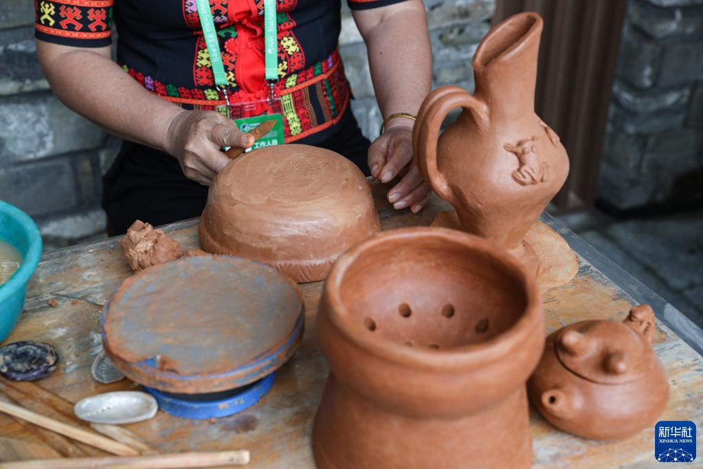3月28日,黎陶非遺傳承人在展覽現場制作陶器。