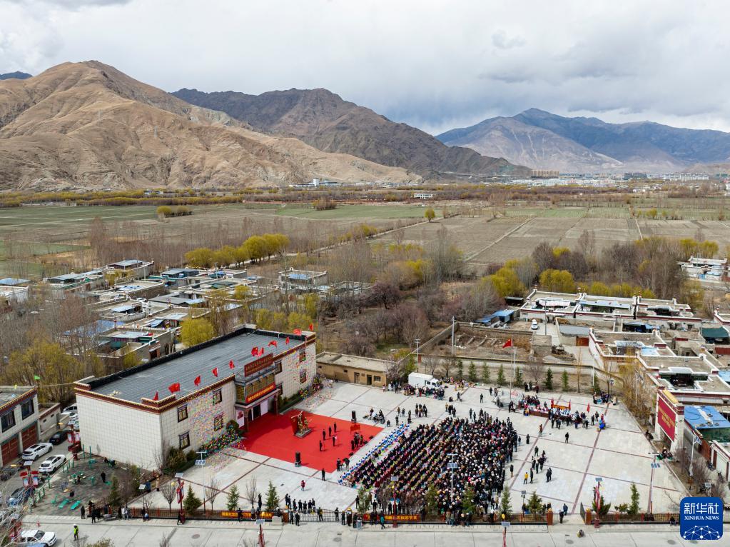 3月28日,在山南市乃東區,西藏民主改革第一村陳列館重新開放,人們在陳列館前舉行儀式,紀念西藏百萬農奴解放64周年(無人機照片)。