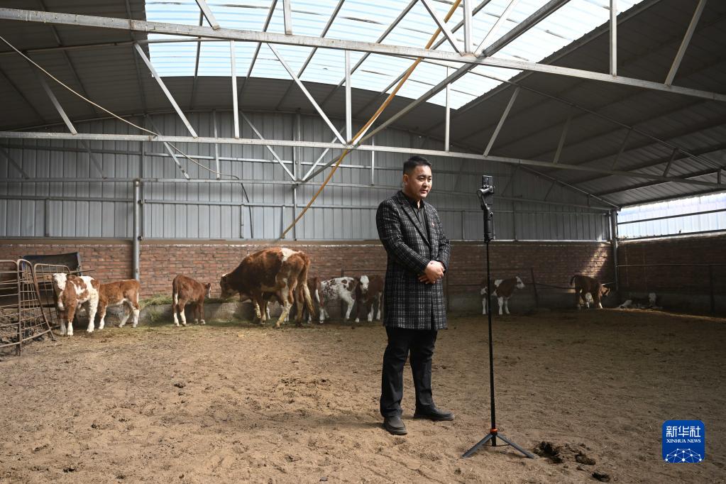 3月28日,嘎查黨支部書記寶音賀希格在巴彥額日和圖嘎查集體所有的牛棚內直播。