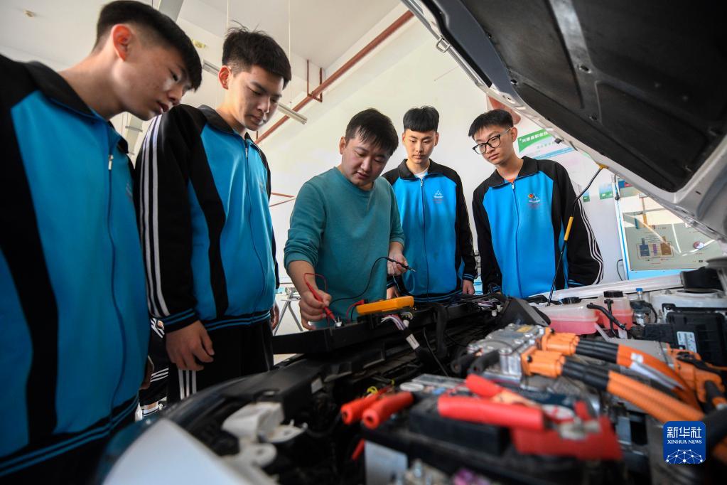 3月28日,在興隆縣職教中心,學生在進行新能源汽車維修實訓。