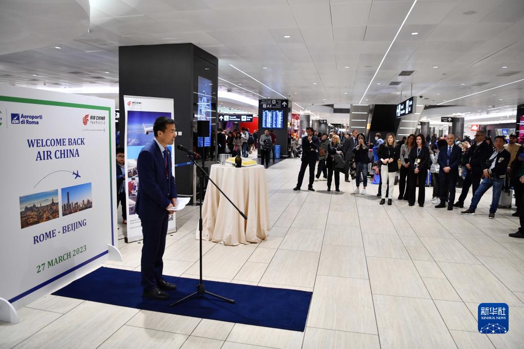 3月27日,在意大利羅馬菲烏米奇諾機場,人們參加國航羅馬至北京直飛客運航線復航儀式。