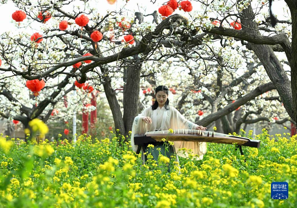 3月28日,古箏演奏者在石家莊市趙縣梨果生產基地觀光區表演。