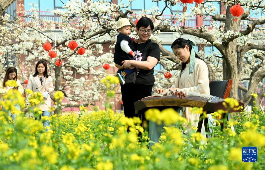 3月28日,游客在石家莊市趙縣梨果生產基地觀光區欣賞古箏演奏。