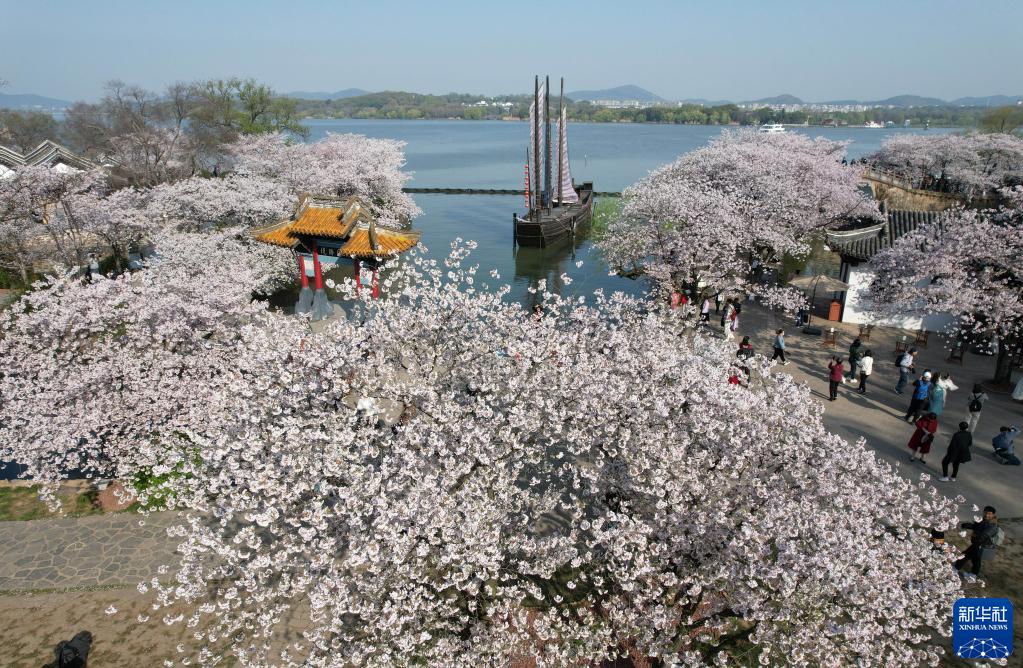 連日來,江蘇無錫太湖黿頭渚景區櫻花爛漫,吸引市民游客前來賞花游玩。