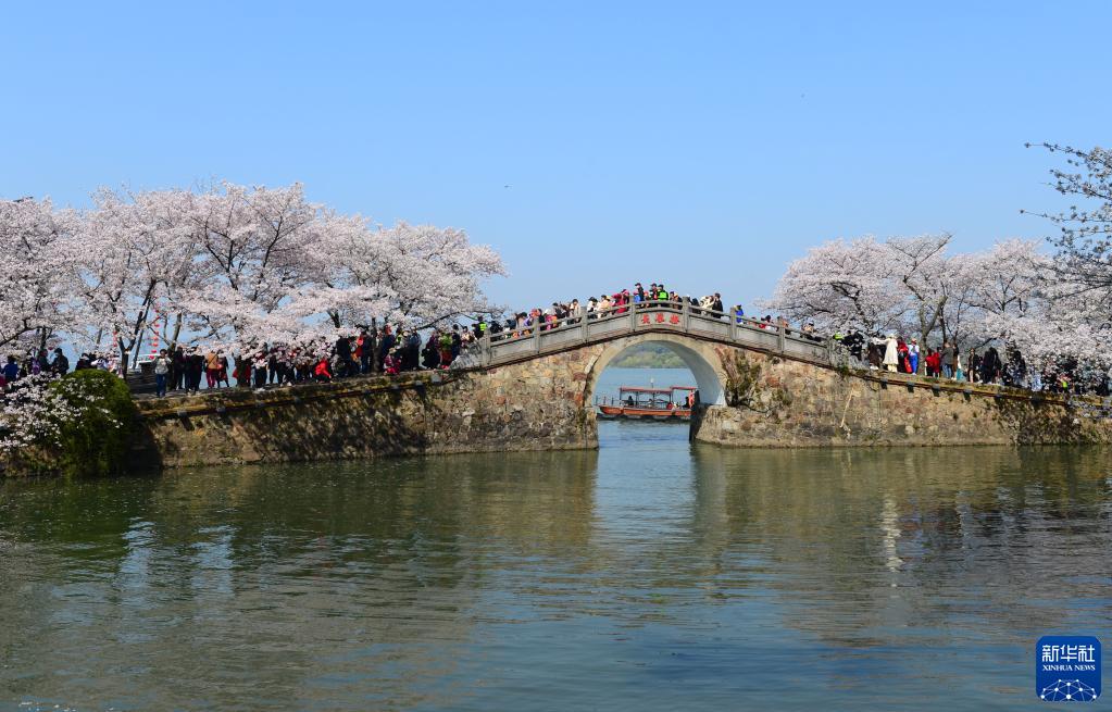 連日來,江蘇無錫太湖黿頭渚景區櫻花爛漫,吸引市民游客前來賞花游玩。