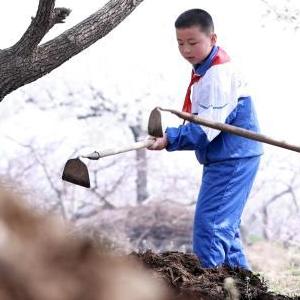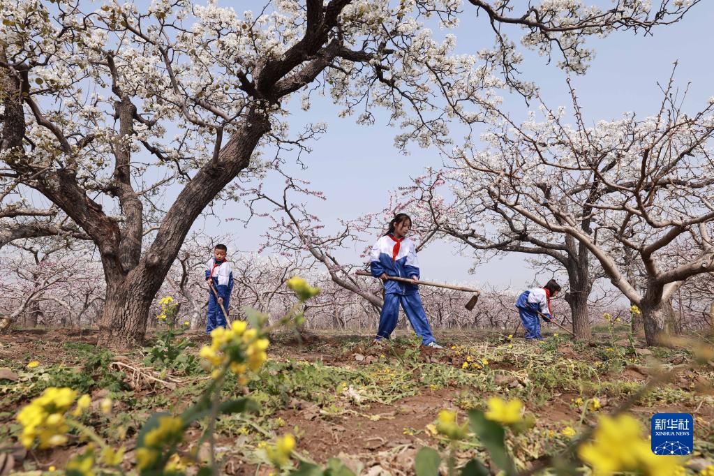 3月28日,內丘縣大都城小學學生在梨園鋤草。