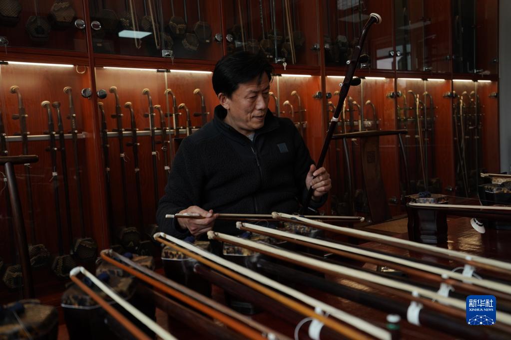 3月28日,制琴師卜廣軍在江蘇無錫梅村街道二胡產業園古月琴坊車間調試二胡。