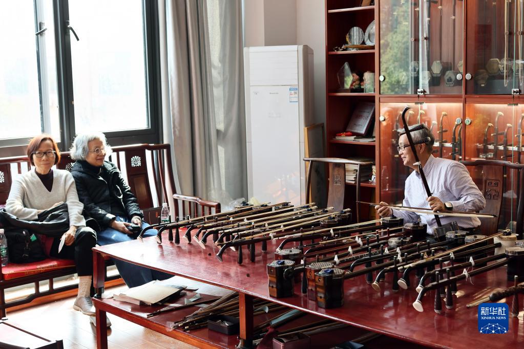 3月28日,在江蘇無錫梅村街道二胡產業園,來自香港的樂器經銷商李開(右一)在試琴。