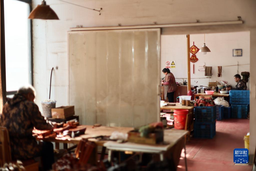3月28日,在江蘇無錫梅村街道二胡產業園,工人在制作二胡。