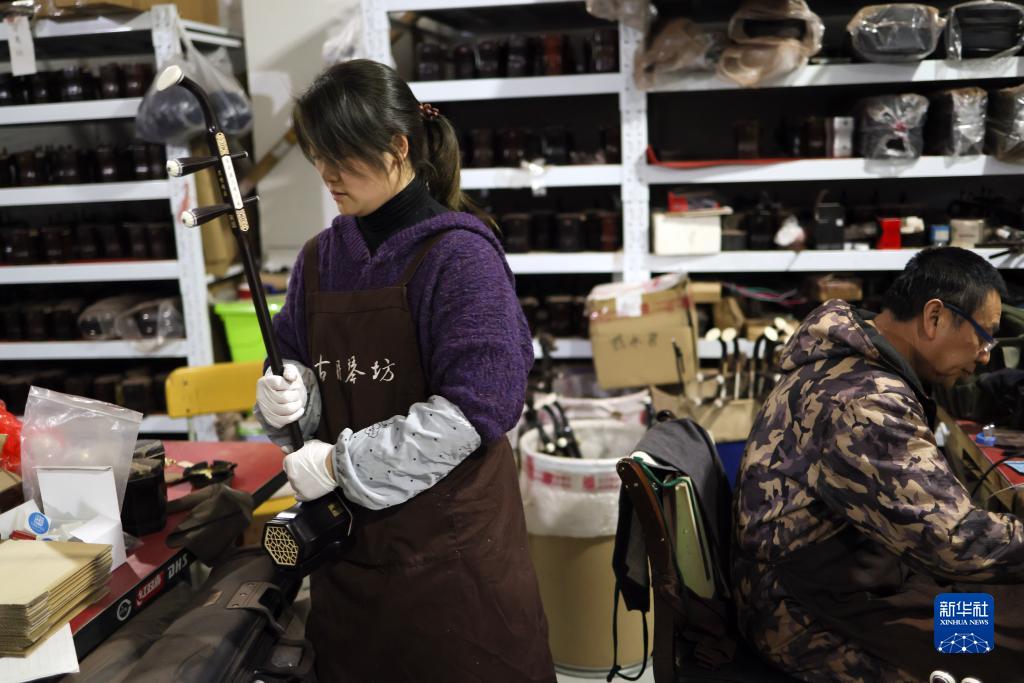 3月28日,在江蘇無錫梅村街道二胡產業園,工人在檢查成品二胡。