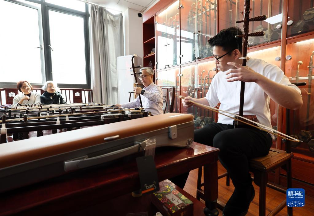 3月28日,在江蘇無錫梅村街道二胡產業園,來自香港的樂器經銷商李開(右二)和來自臺灣的學生王彥翔(右一)共同演奏樂曲。他們專程前來挑選二胡。