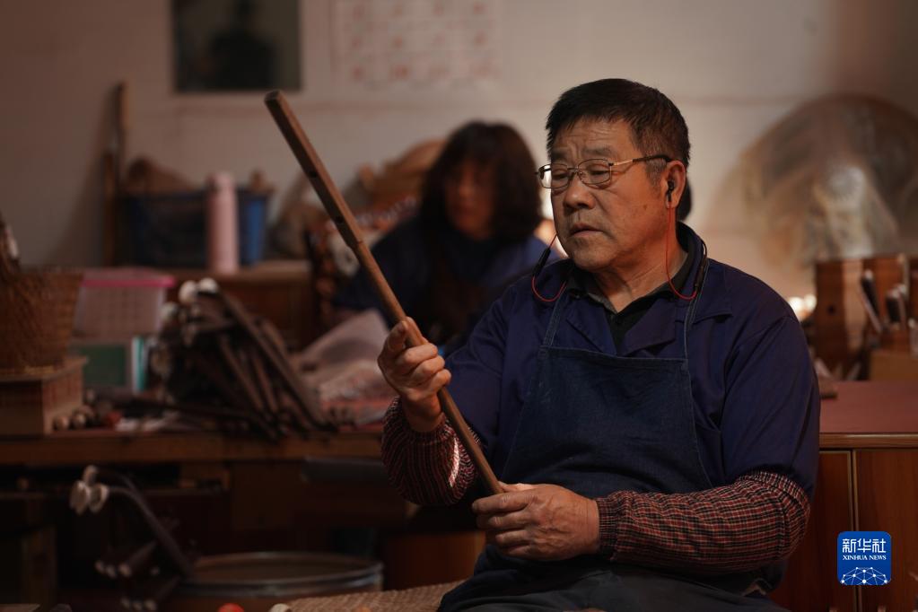 3月28日,工人在江蘇無錫梅村街道二胡產業園古月琴坊車間制作琴桿。