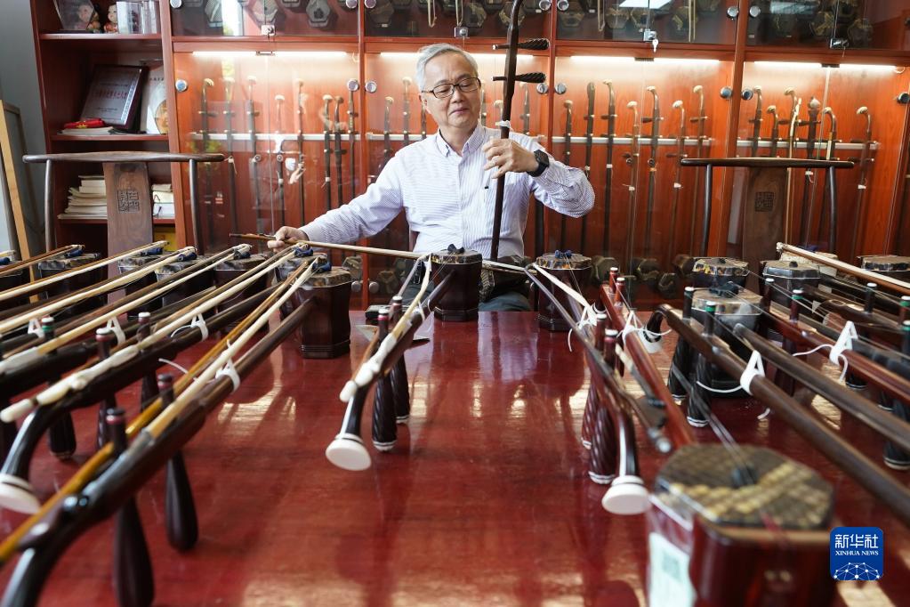3月28日,在江蘇無錫梅村街道二胡產業園古月琴坊車間,來自香港的樂器經銷商李開在試琴。