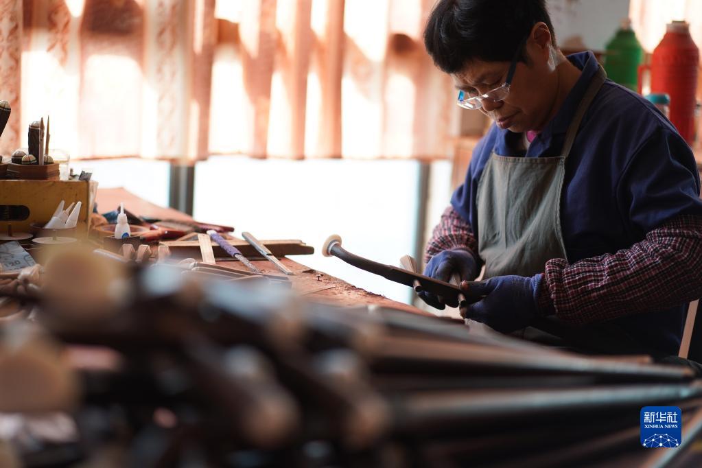 3月28日,在江蘇無錫梅村街道二胡產業園古月琴坊車間,工人在制作二胡。