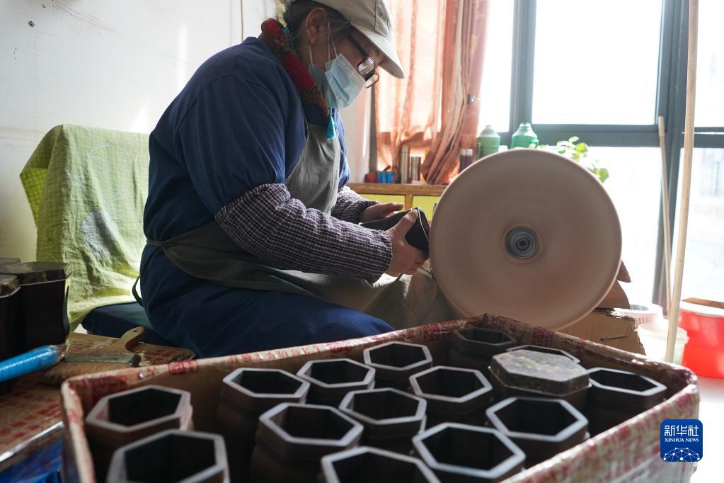 3月28日,在江蘇無錫梅村街道二胡產業園古月琴坊車間,工人在對琴筒進行拋光。