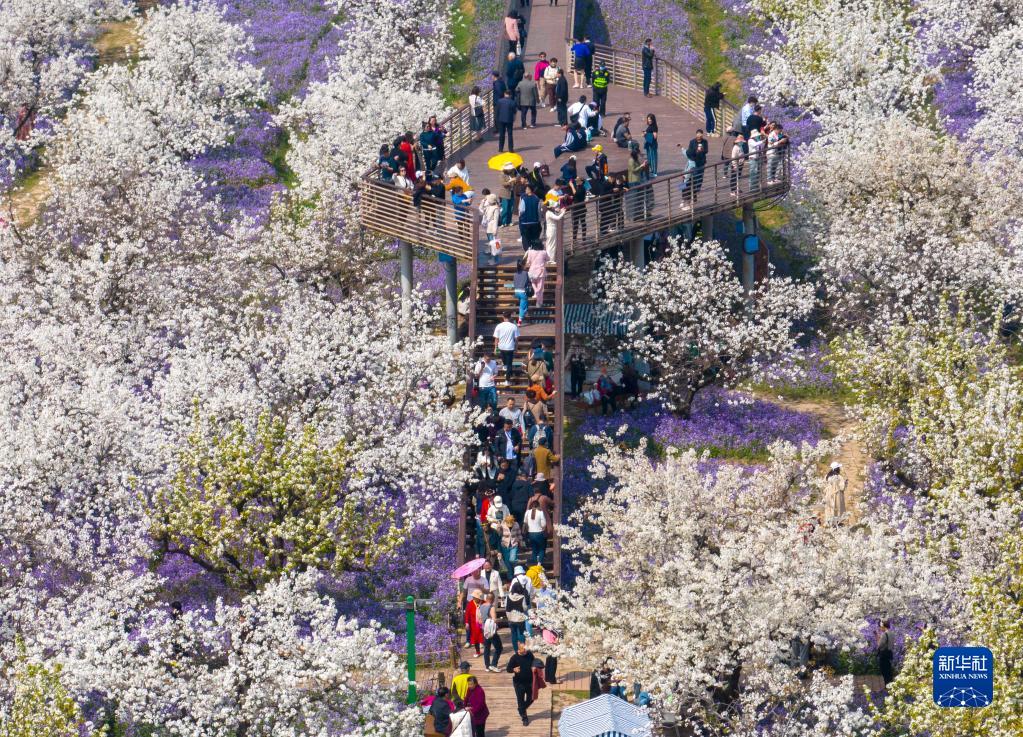 3月28日,游客在江蘇省宿遷市三臺山森林公園“梨蘭會”景區內賞花游玩(無人機照片)。