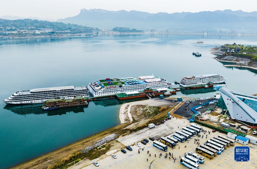 3月28日,游客從三峽大壩上游湖北省宜昌市秭歸縣秭歸旅游港下船上岸(無人機照片)。