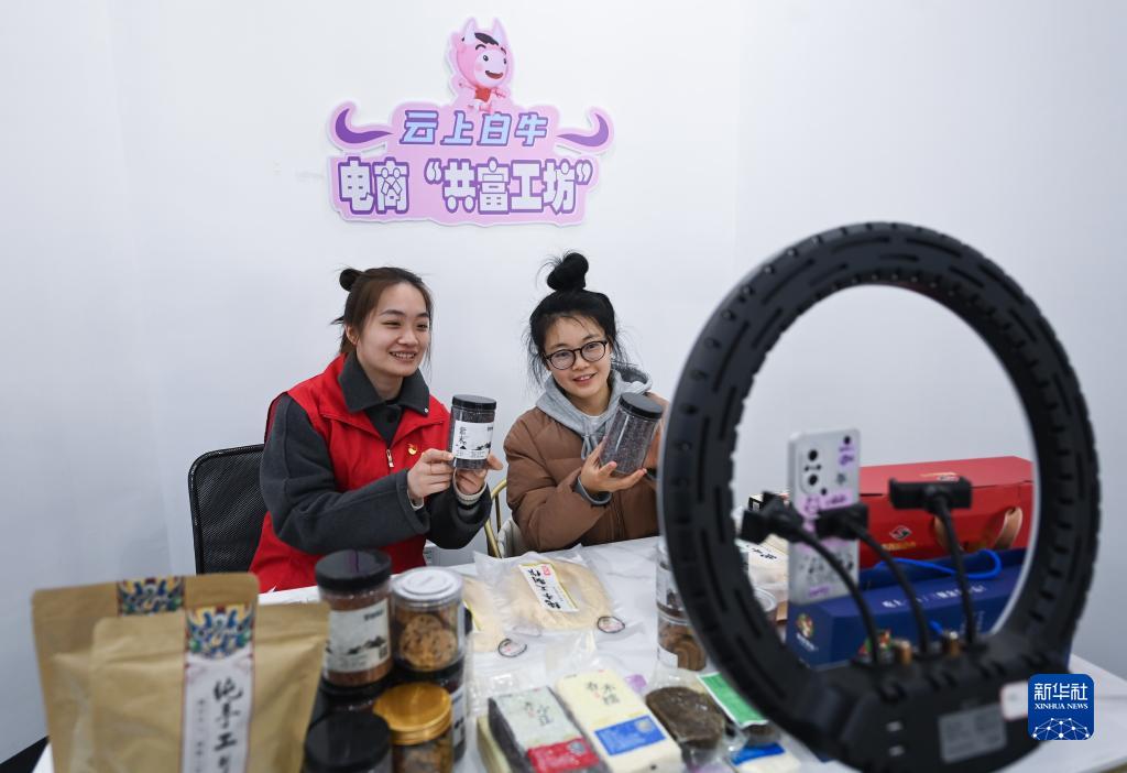 3月28日,在杭州市臨安區昌化鎮白牛村的云上白?!る娚獭肮哺还し弧敝辈ラg,網格黨員(左)與電商主播一起推介特色農產品。