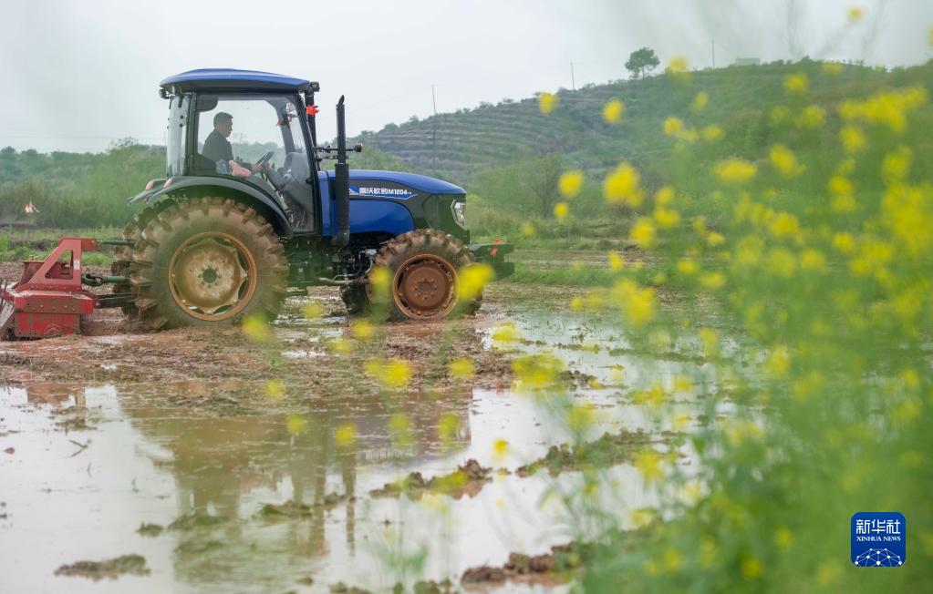 3月28日,在湖南省永州市道縣上關街道東進村,農機手駕駛農機在翻耕稻田。
